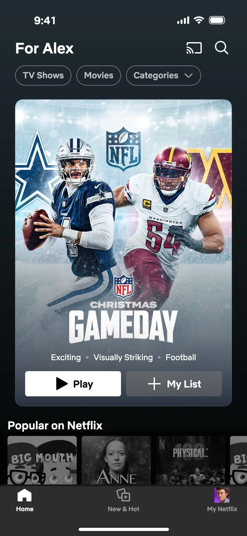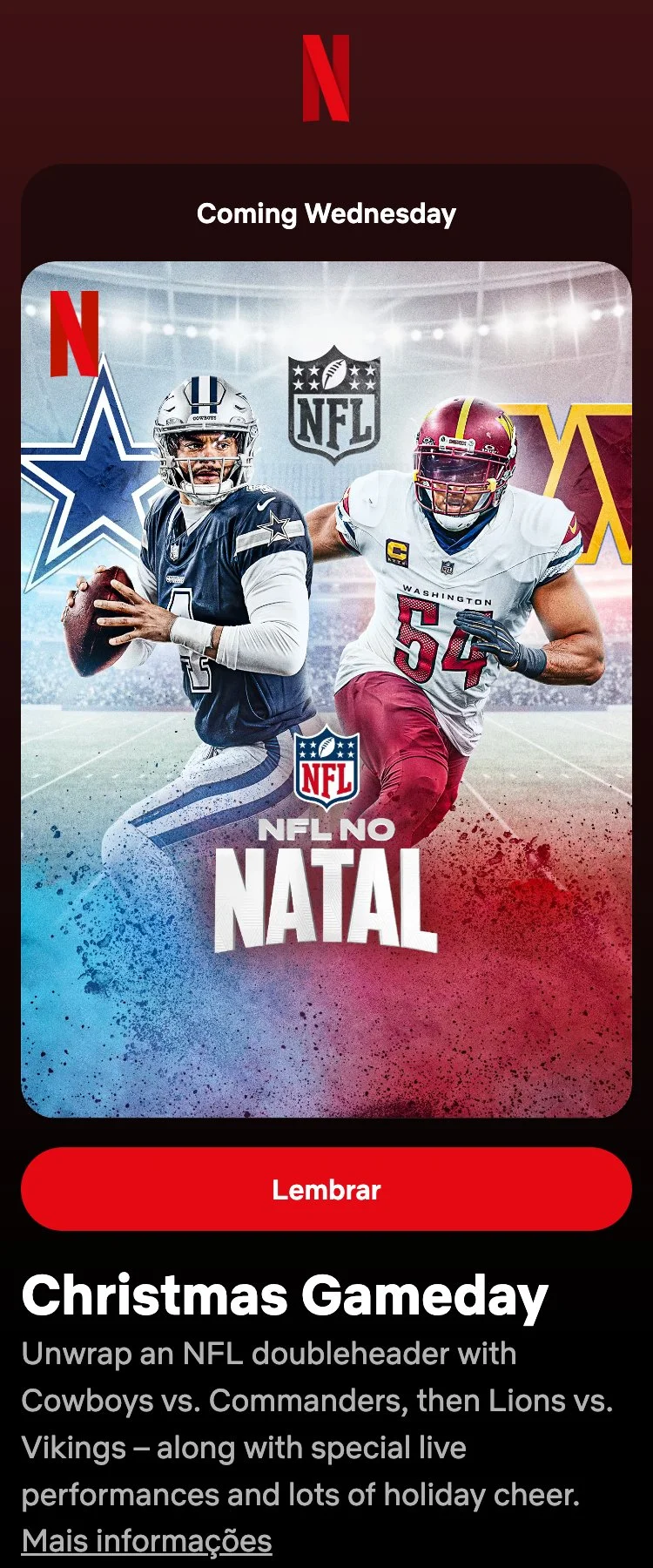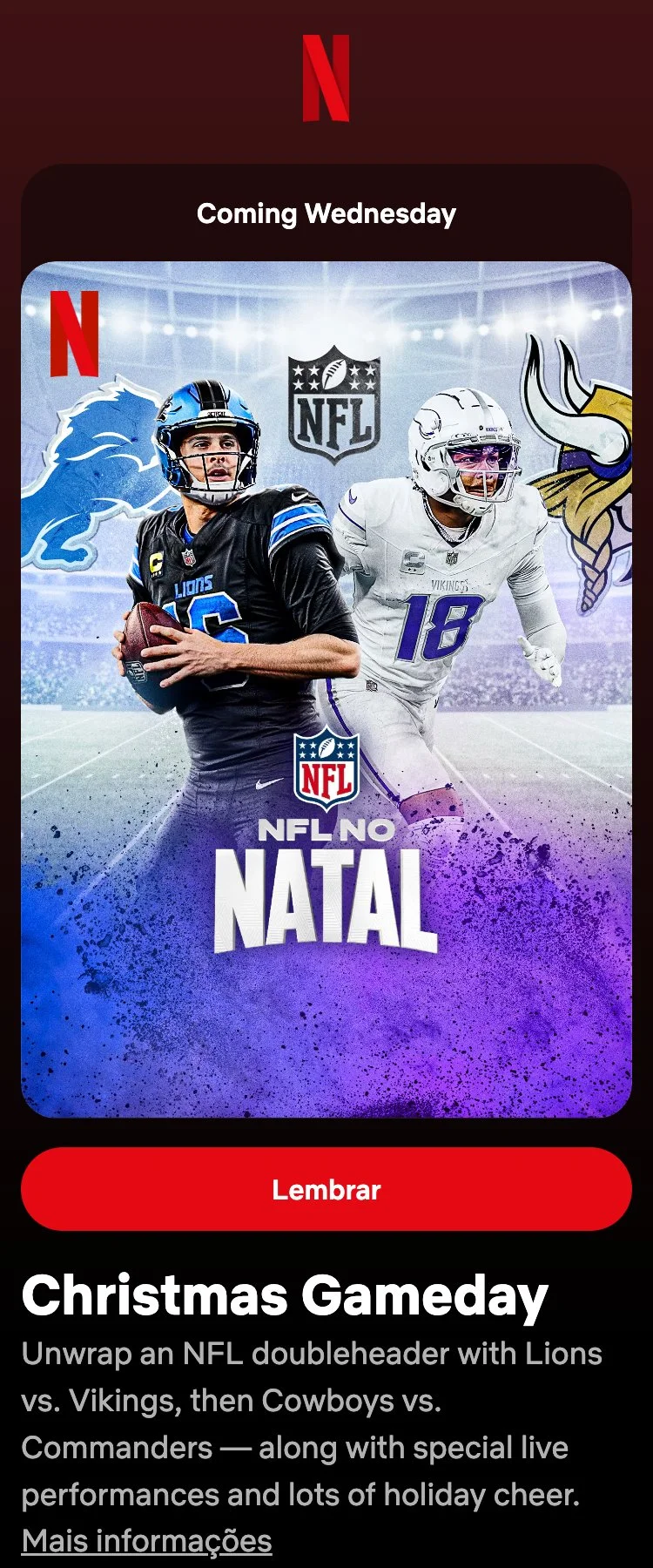 Approach: For the launch of Christmas Gameday we partnered with the NFL and Netflix to create on-service art that captures the adrenaline-filled spirit of the holiday across regions — embracing snowy, cinematic stadiums for Northern Hemisphere territories and bolder color for Southern Hemisphere.